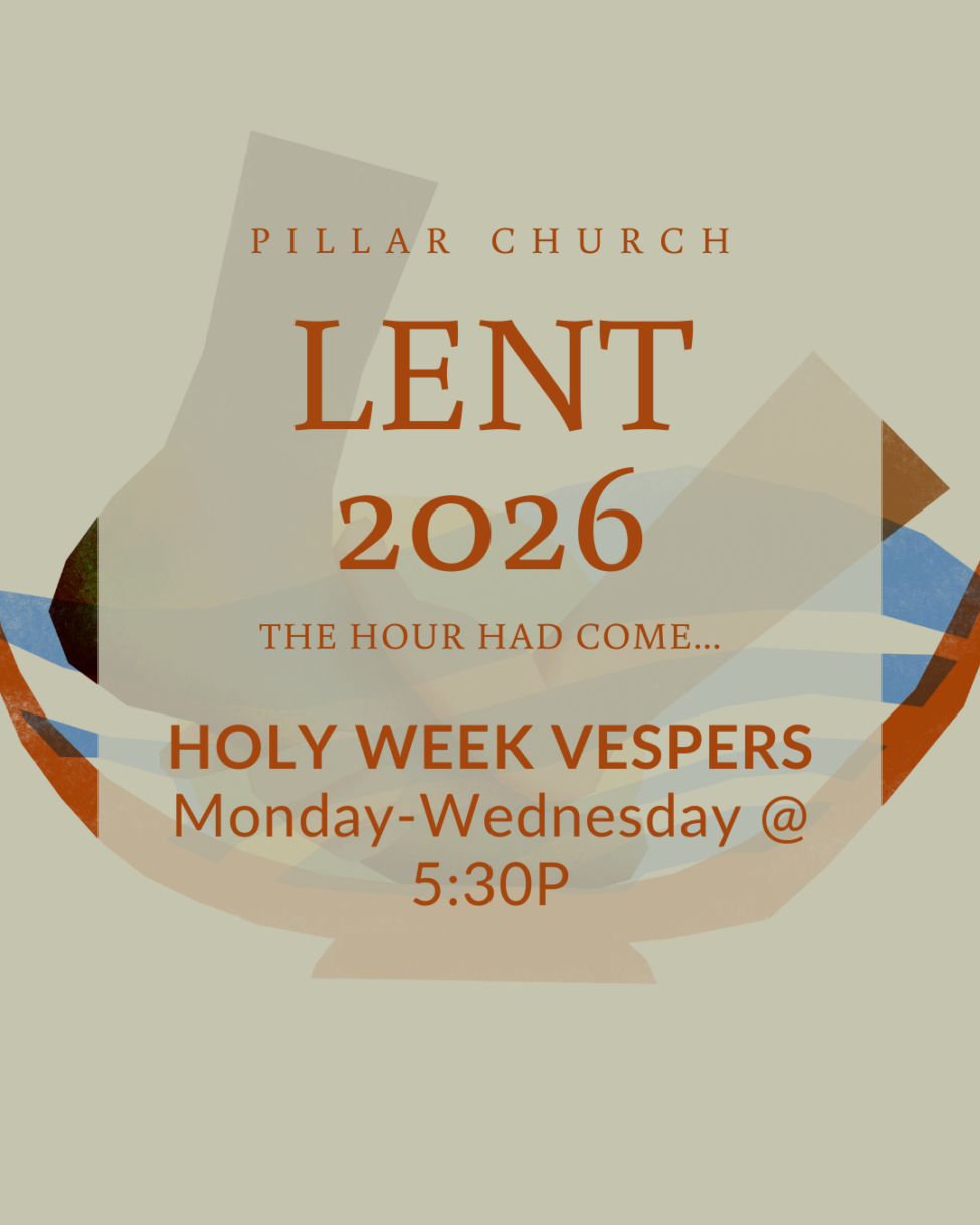 Holy Week Vespers: As we continue our journey through Lent we approach Holy Week, the six days leading up to Resurrection Sunday that more specifically walk through the events of Jesus’ betrayal, trial, and crucifixion. Pillar is hosting daily vespers (evening prayer) services throughout Holy Week. Monday through Wednesday we will meet in the sanctuary at 5:30pm for a time … Read More